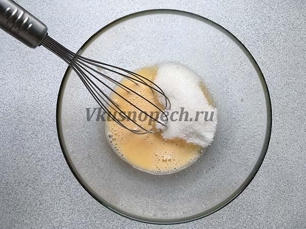 Яйца с сахаром помещаем в миску, для замешивания теста. Размешиваем венчиком.