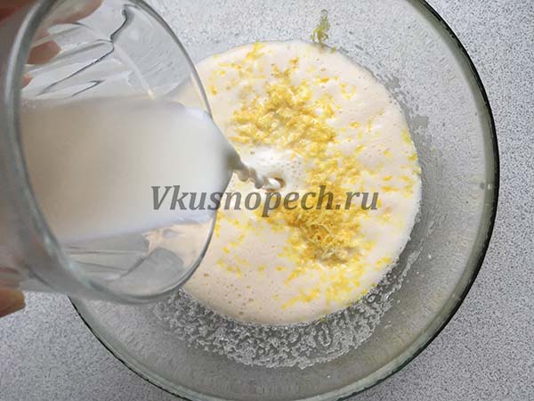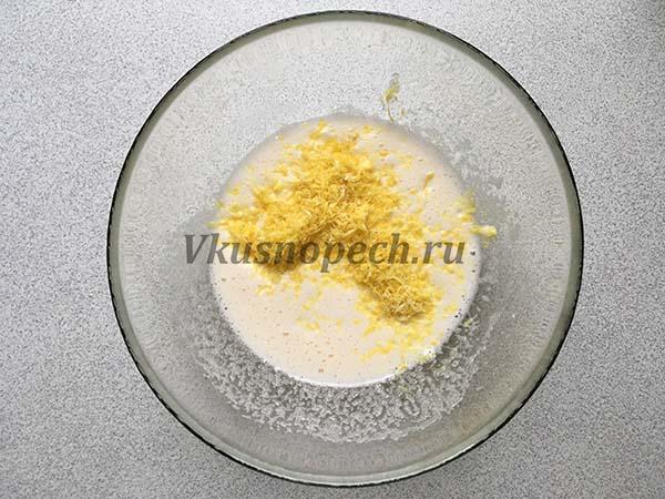 Лимон обязательно нужно тщательно помыть. После чего, снимаем цедру. Добавляем ее в яичную массу. Сюда же выжимаем сок с половинки.