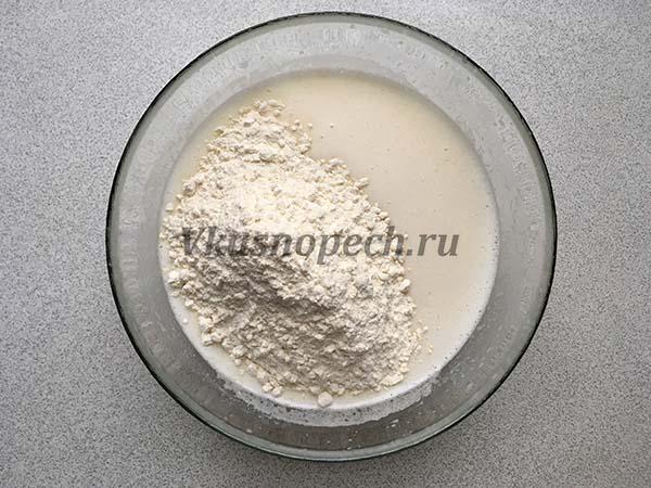 Добавляем просеянную муку с разрыхлителем. Вымешиваем до однородности.