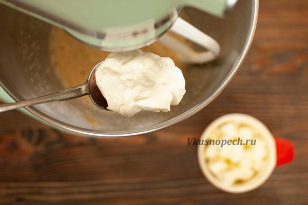 К яйцам отправляем сметану и сливочное масло. Взбиваем на средней скорости. Эти ингредиенты должны быть комнатной температуры. Подумайте об этом заранее, и достаньте их из холодильника за пару часов до начала приготовления.