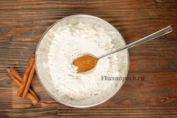 Муку просеять. Смешать с разрыхлителем и корицей. Добавить половину сыпучей смеси в основную массу. Тщательно перемешать до однородности.