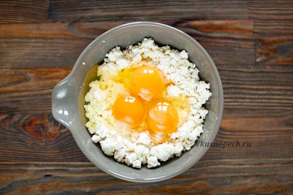 Помещаем творог в глубокую миску. Разминаем его вилкой. Добавляем яйцо и перемешиваем до однородности.