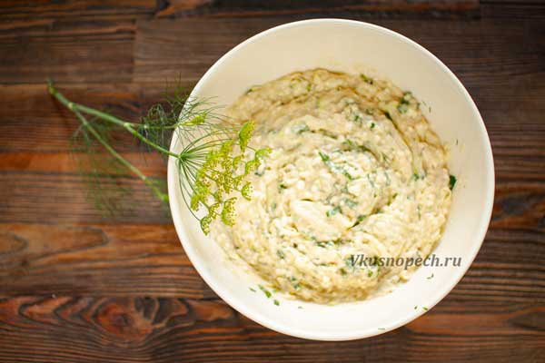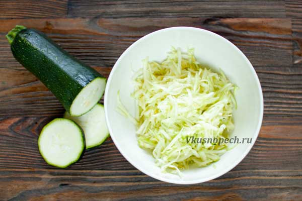 Кабачок промыть, очистить от кожуры (при желании), натереть на терке и добавить к творогу. Если кабачок выделил довольно много жидкости, от нее нужно избавиться, слегка зажав между ладоней натертый овощ.