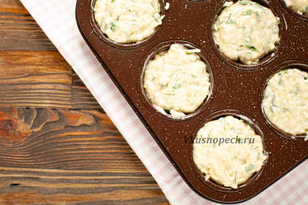Смазываем формы для выпечки растопленным сливочным маслом. Раскладываем тесто по формам.