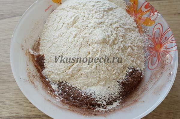 Добавляем просеянную муку. На этом этапе тесто будет довольно густым. Аккуратно вмешайте всю муку, чтобы масса стала однородной.