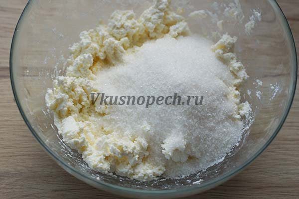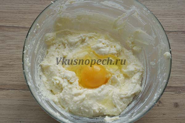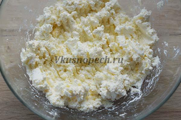 В глубокой емкости растираем творог и очень мягкое сливочное масло. Достать из холодильника его следует минимум за пару часов до начала приготовления.
