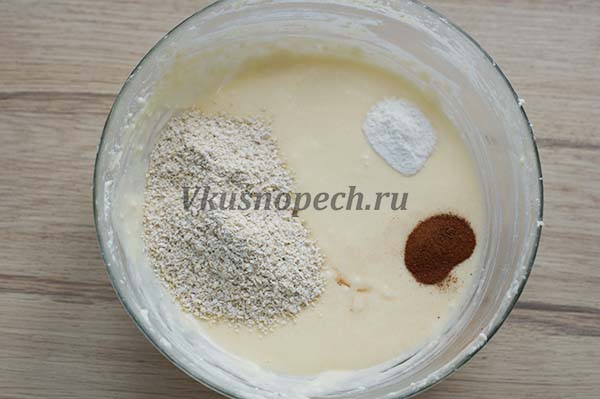 Отправляем в основную массу разрыхлитель, корицу и муку. Муку всыпаем не всю сразу, и в 2-3 приема.