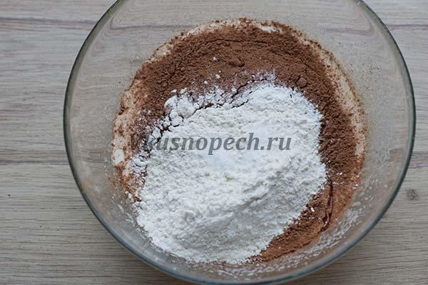 Далее нам нужно ввести сыпучие. Можно просто добавить в яичную массу просеянную муку, какао, разрыхлитель и соль. Но если вы никуда не спешите, лучше смешайте эти ингредиенты в отдельной сухой посуде, а затем добавьте в основную массу.