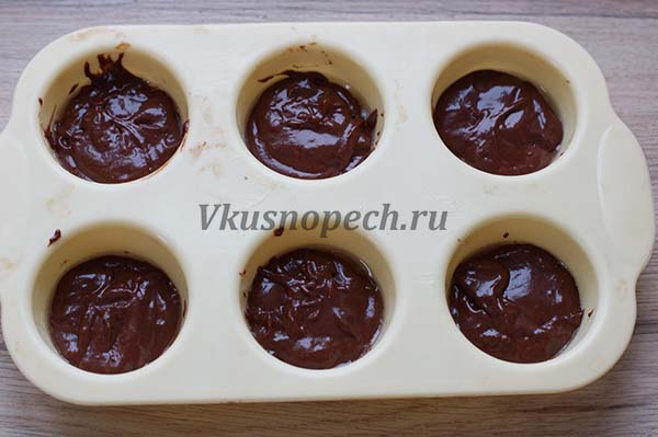 Раскладываем тесто по формам. Из указанного количества ингредиентов вы получите 6 вкуснейших шоколадных кексов.