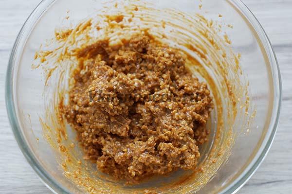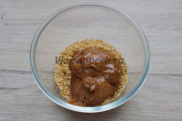 Смешиваем арахис со сгущенкой. Пропорции для начинки в рецепте указаны приблизительные. Все зависит от ваших вкусовых предпочтений и от того, насколько большое углубление вы сделаете в самом кексе. Поэтому ориентируйтесь по ходу приготовления.
