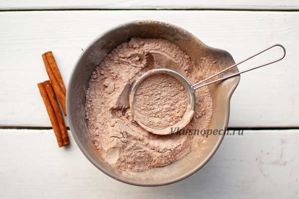 В другой емкости смешиваем муку, какао, разрыхлитель, корицу и соль. Сухую смесь обязательно нужно просеять через сито.