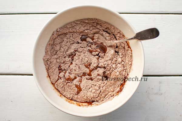 Добавляем смесь сухих ингредиентов к жидким. Замешиваем однородное тесто.