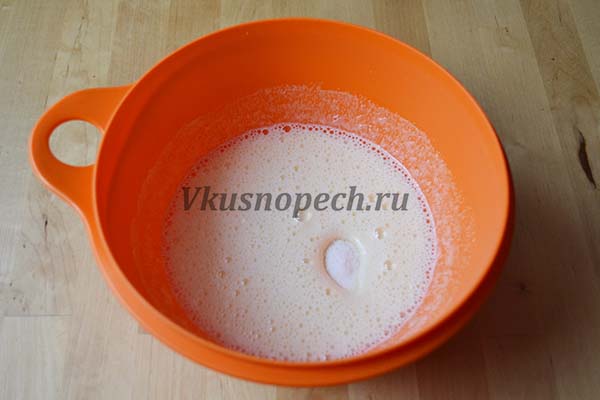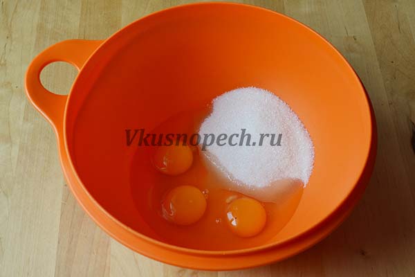 Яйца, обычный и ванильный сахар отправляем в глубокую миску. Взбиваем миксером до пышности.