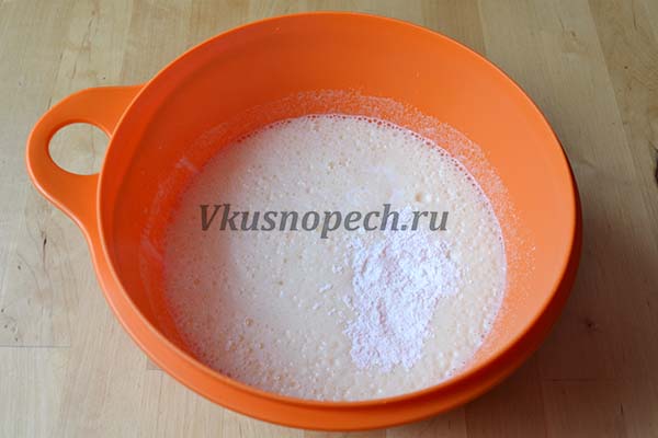 Всыпаем просеянную муку. Взбиваем миксером на минимальной скорости до однородности.
