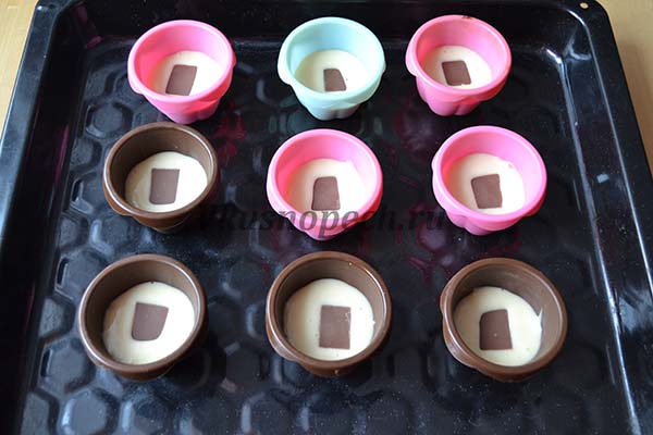 Заполняем капсулы для выпечки примерно на половину. В центр помещаем начинку. У меня – шоколад. Можно использовать арахисовую пасту, сгущенку, нутеллу.