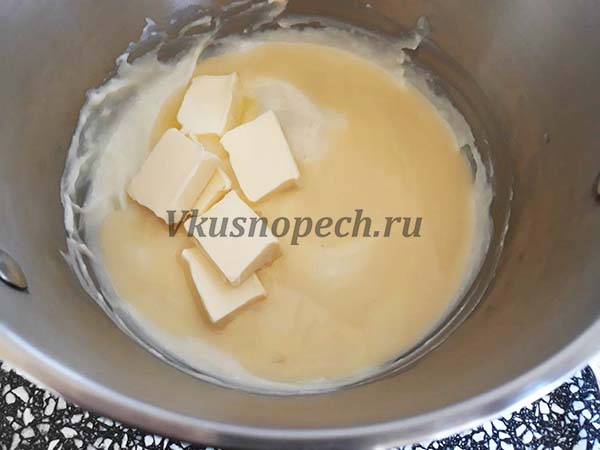 Если хотите получить более густой крем, тогда сливочное масло взбиваем миксером отдельно, до пышности и побеления. И только после этого соединяем охлажденную заварную основу с маслом.