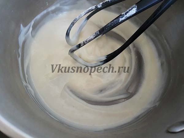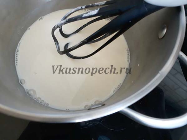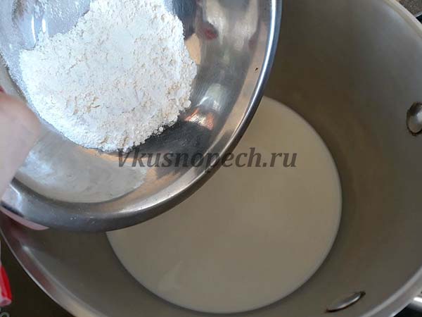 Затем, дозировано подсыпаем муку, беспрерывно помешивая. Не допускаем появление комочков.