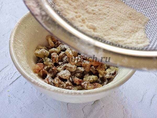 Промываем сухо фрукт, подсушиваем салфеткой и присыпаем горсточкой муки. -