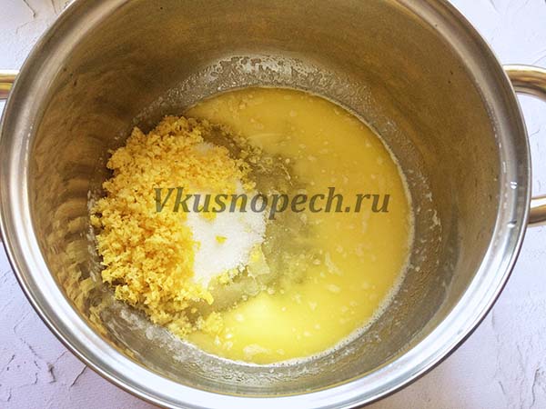 В растопленное масло вводим обычны, ванильный сахар и натертую кожуру цитруса.