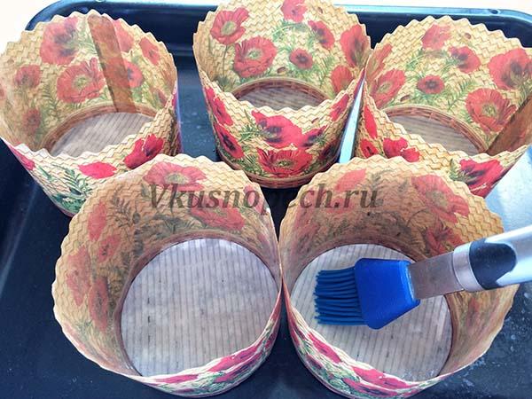 Форму для выпекания (бумажную) смазываем маслом, металлическую выстилаем промасленной пергаментной бумагой. Наполняем формочки на половину высоты.