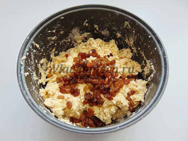 Добавить изюм. Продолжить замес еще в течение 10 минут.