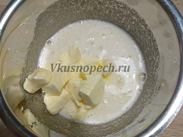 Размягченное (при комнатной температуре) сливочное масло нарезать небольшими кусочками, добавить в сахарно-яичную смесь и перемешать.