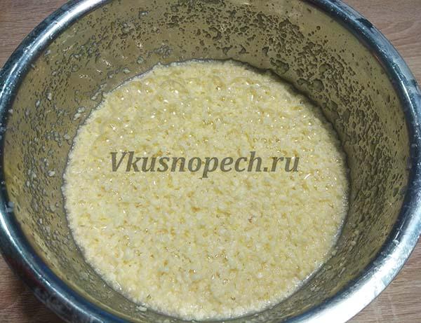 Стандартно для многих рецептов, первым делом, готовится опара, и кулич из александрийского теста не исключение. Для этого в довольно глубокой емкости соедините 2 яйца, 1 желток и сахар (230 г). Размешать до растворения кристалликов. Взбивать в пышную пену не требуется.