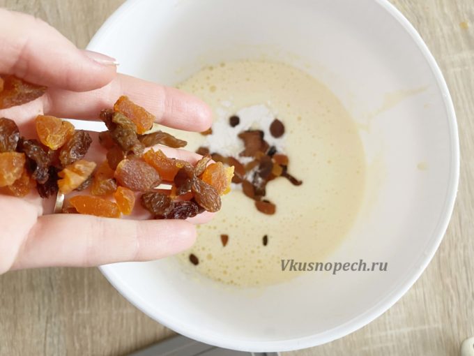Добавляем сухофрукты. Предварительно их можно замочить в алкоголе (по желанию). Перемешиваем.