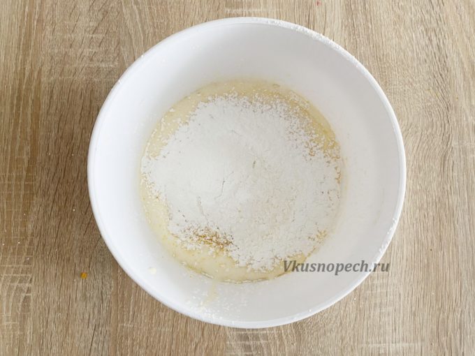 Просеиваем муку и крахмал. Взбиваем миксером до однородности. Тесто получается жидковатое (как на оладьи примерно). Так что, не пугайтесь.
