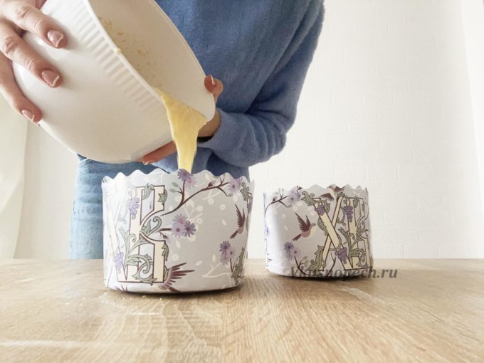 Наполняем тестом формы для выпечки чуть больше половины. Я использую бумажные формы, и вам советую. В них удобно выпекать традиционные и диетические куличи. Также, они позволяют сохранять подобную выпечку свежей довольно долго.