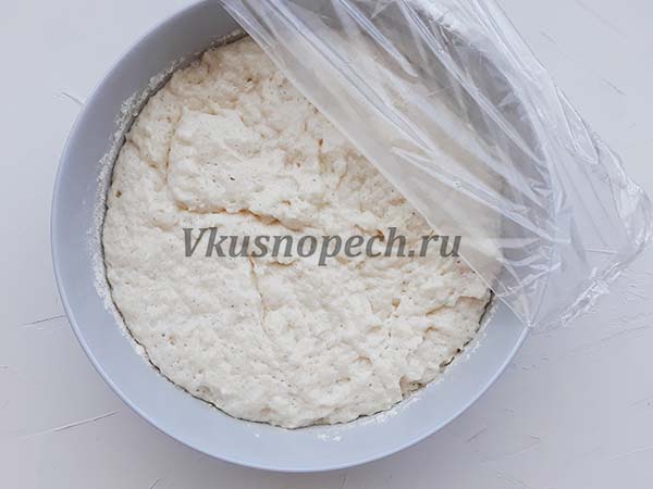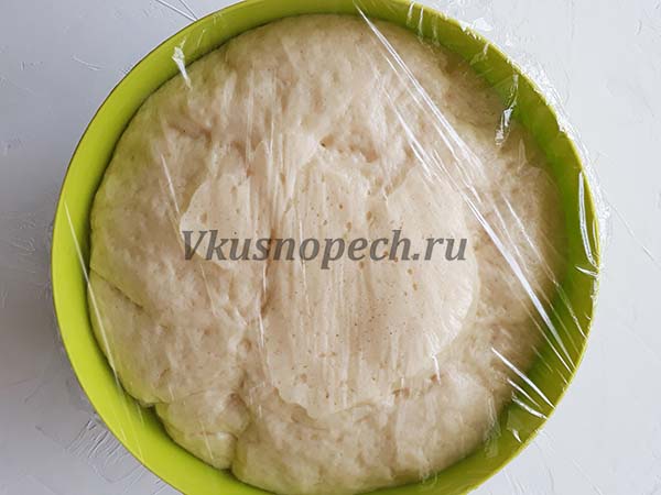Глубокую миску смазываем маслом. Кладем в нее готовое тесто. Накрываем пленкой и отправляем на расстойку.