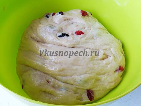 После расстойки, массу нужно обмять. По желанию добавляем сухофрукты. Я добавила сушеную клюкву, вишню и черный изюм.