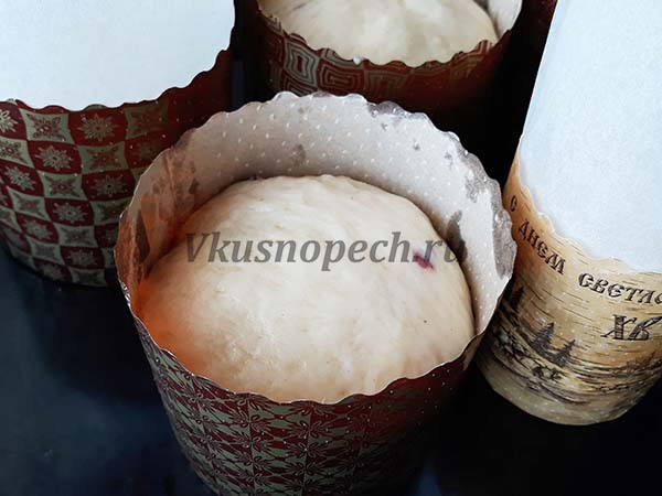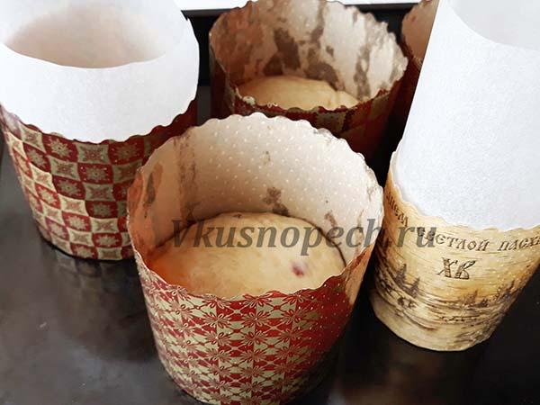 Раскладываем заготовки по формам. Накрываем полотенцем и снова на расстойку минут на 30-40. После чего, выпекаем в разогретой до 180 градусов духовке. Время выпечки зависит от размера кулича. Ориентировочно от 40 до 60 минут. Готовность проверяйте деревянной шпажкой.