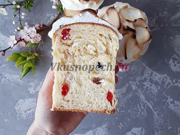 Вот такие шикарные праздничные куличи на сливках у меня получились. Рецепт действительно удачный. В разрезе выпечка выглядит очень аппетитно. Однозначно рекомендую!