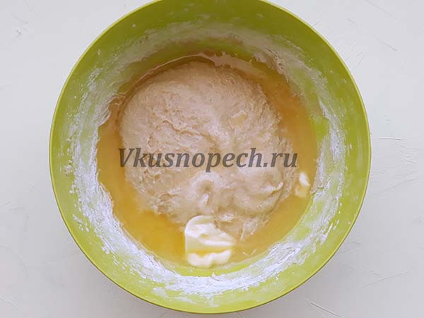 Когда практически всю муку ввели, добавляем очень мягкое (можно слегка растопленное) сливочное масло.