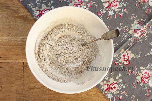 В полученную массу отправляем сухую смесь. Замешиваем тесто.