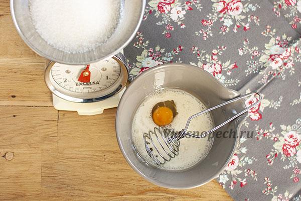 В другой миске смешать до однородности яйцо, обычный и ванильный сахар, молоко, масло и соль.