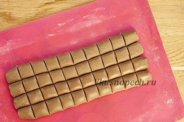Полученную массу делим на 4 части. Из каждой формируем жгут длинной около 30 см. Затем разрезаем каждый жгут на 15 частей.