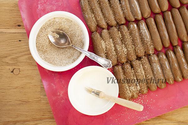 Из каждого кусочка формируем маленькие жгутики длиной 8 см. Смазываем каждый молоком и посыпаем смесью сахара с корицей.