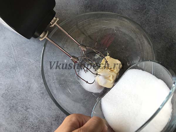Посредством миксера, взбиваем сливочное масло и сахар около 5 минут. Масса должна стать воздушной и белой.