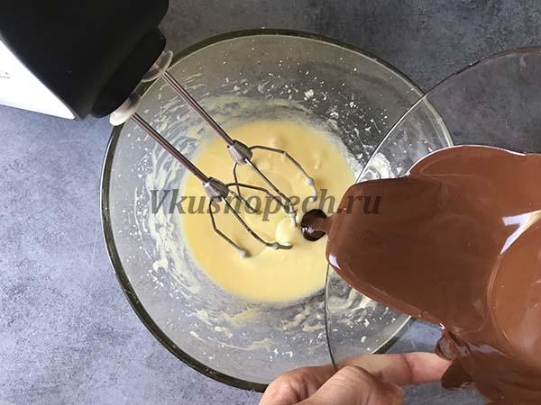 Тонкой струйкой, не прерывая работу миксера, вводим слегка остывший растопленный шоколад.