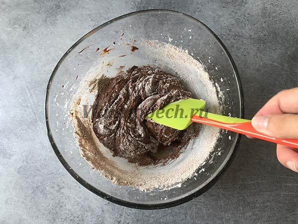 В отдельной емкости смешиваем муку с разрыхлителем и какао, и вводим сухую смесь в тесто, в три приема. Размешиваем лопаткой.