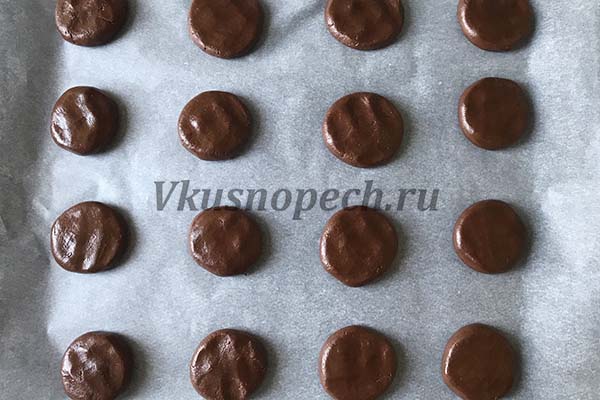 Формируем шарики из получившейся шоколадной массы, и выкладываем их на противень, застеленный пергаментом. Сверху заготовки необходимо немного приплюснуть. Сделать это можно просто рукой или дном стакана.