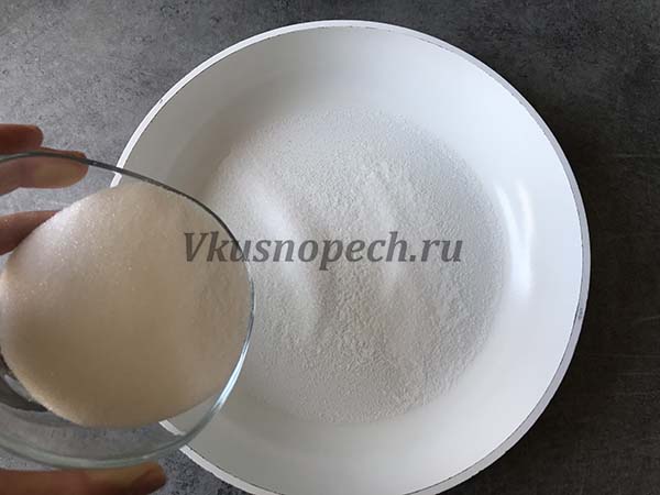 Кристаллики начнут постепенно таять. Размешивать лопаткой ни в коем случае нельзя, иначе образуются комочки, от которых очень сложно, а может даже и не возможно, будет избавиться. Периодически приподнимаем сковороду и немного встряхиваем сахар.