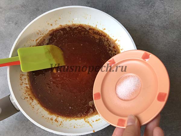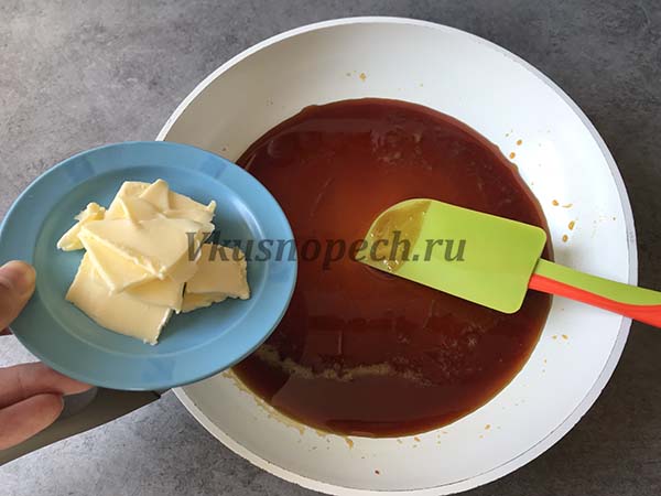 Когда масса превратится в жидкую карамель, приобретет приятный янтарный оттенок, снимаем сковороду с огня и добавляем сливочное масло.