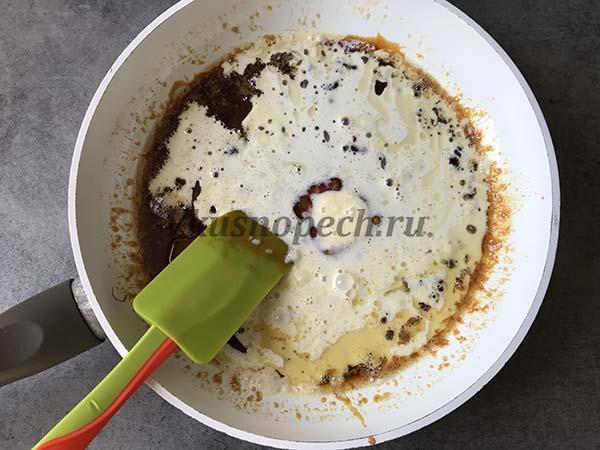 Вводим небольшими порциями очень горячие сливки, размешиваем и снова ставим на плиту. Карамельный соус доводим до кипения и варим около 4 минут.