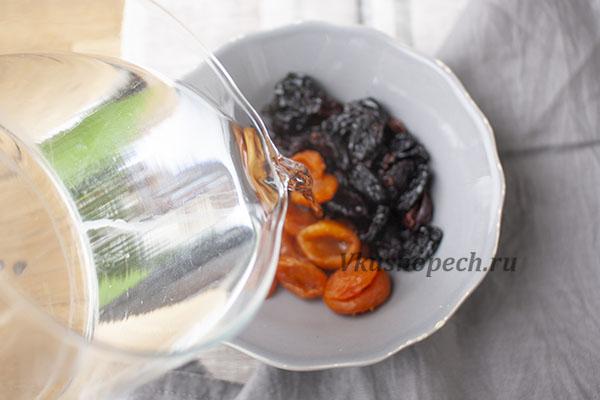 Сухофрукты залить горячей водой и оставить минут на 5. Затем слить фоду и порубить на мелкие кусочки.