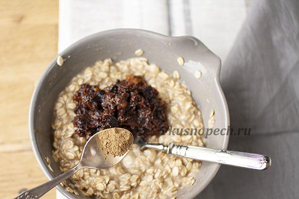 К бананам отправляем овсянку, подготовленные измельченные добавки, мед и корицу. Хорошенько все перемешиваем.