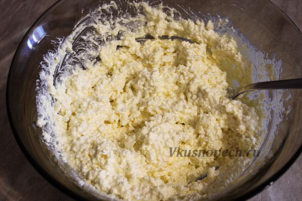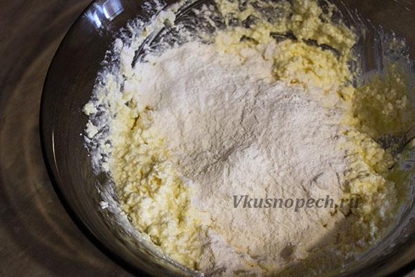 Добавляем муку (400 гр.) к творожной массе. Остаток муки добавить по необходимости. Итоговое ее количество будет зависеть от влажности творога.