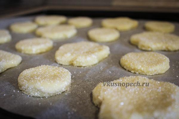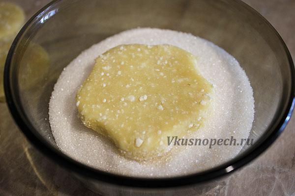 Каждую заготовку обмакиваем одной стороной в сахар, слегка прижимаем ладонью, чтобы он не осыпался.